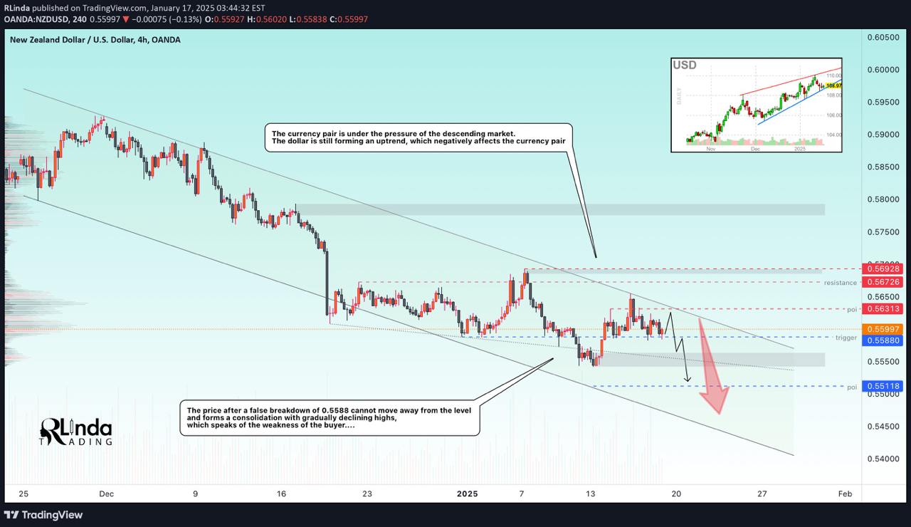 On H4, the price continues to test the support at 0.5588 and a local descending triangle is forming amid pressure from the bears. Possible retest of the channel resistance before further decline.