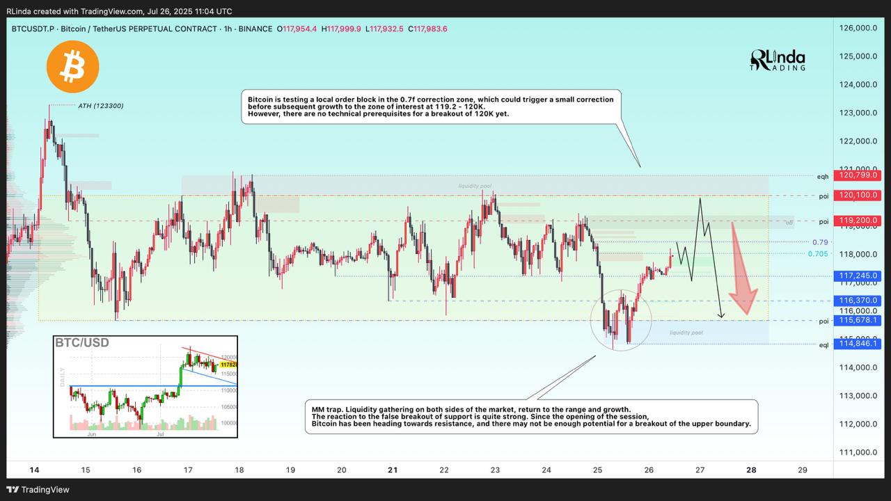BTC is consolidating. However, a local downward trading range is forming relative to the current setup. What is the probability of a correction continuing to 112K or growth to 125K?
