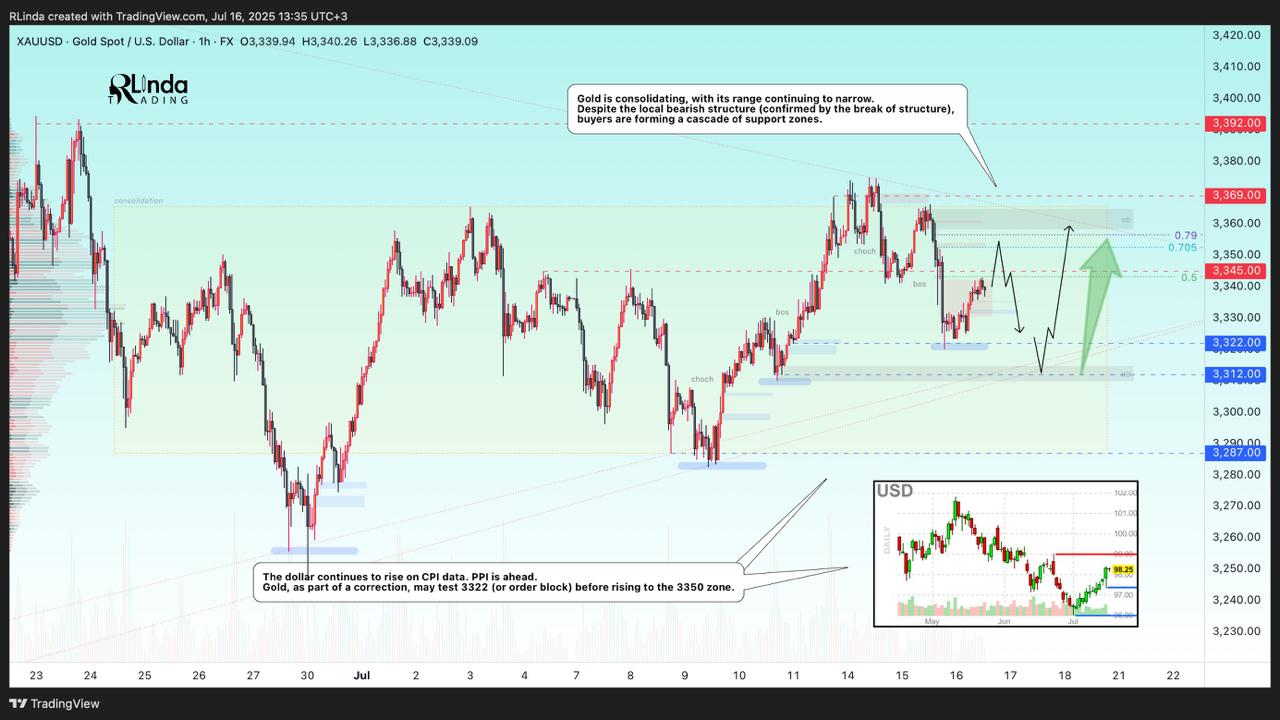 Gold is recovering slightly but remains under pressure amid rising bond yields and a stronger US dollar. Higher inflation in the US reduces the chances of a quick Fed rate cut. Traders are cautious ahead of the PPI data release. If producer inflation exceeds forecasts, the dollar may rise again, putting further pressure on gold