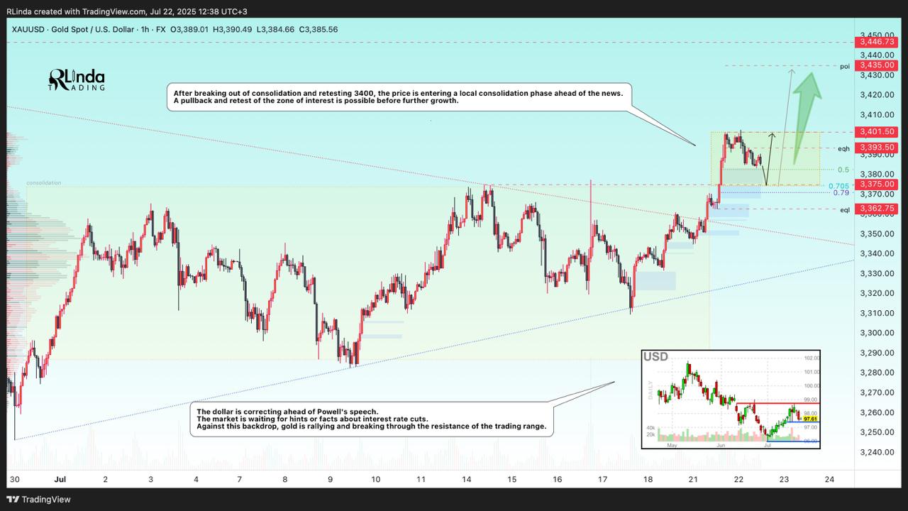 The price of gold is correcting from 3400. The reason is profit-taking ahead of Powell's speech at 12:30 GMT and waiting for clarity on US trade negotiations with the EU and Japan before August 1.