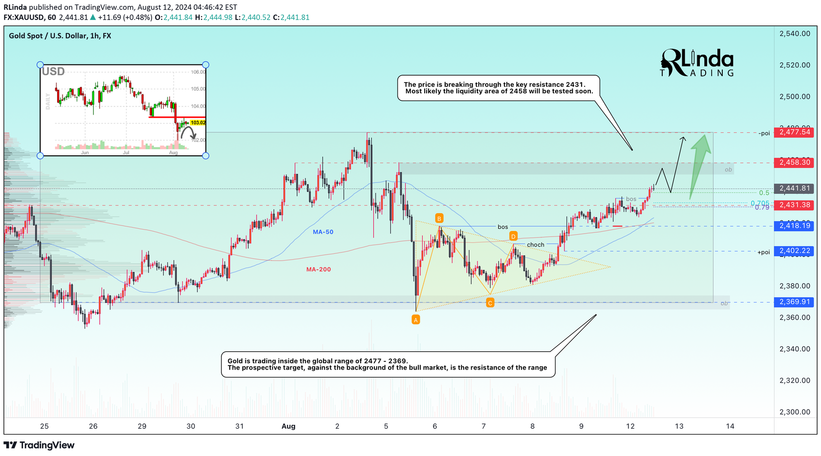GOLD has been breaking through the key resistance 2431 since the opening of the session and is holding towards the liquidity zone 2458. Ahead of PPI, which may set a short-term tone in the market